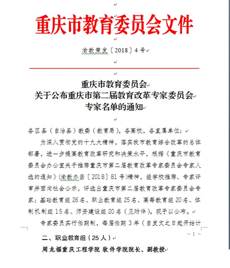 我校软件学院院长周龙福副教授入选重庆第二届教育改革专家委员会专家库成员