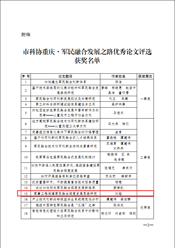 本网讯(科技处/夏冬梅、大学生记者团)重庆市科学技术协会近日发出专门通知,公布“重庆·军民融合发展之路优秀论文”评选结果,我校土木学院刘超博士提交的论文《军事工程保障军民融合深度发展思路研究》榜上有名,被评为优秀论文二等奖。