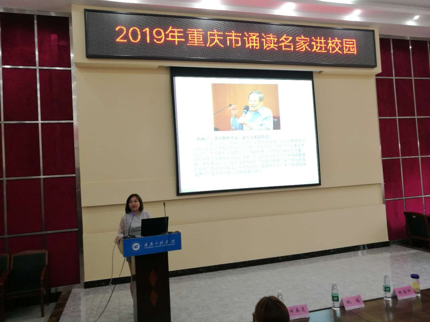 本网讯(语委办 邹春霞)为传承中华优秀传统文化、提高当代大学生诵读水平,重庆市语言文字工作委员会、重庆市教育委员会共同主办了2019年“诵读名家进校园”系列活动。