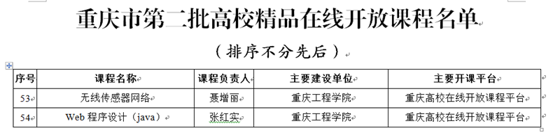 本网讯(文/教务处 魏玉琛)日前,据《重庆市教育委员会关于公布重庆市第二批高校精品在线开放课程认定结果的通知》公布的结果,我校聂增丽老师申报的《无线传感器网络》和张红实老师申报的《Web程序设计(java)》2门在线开放课程,均被认定为重庆市高校精品在线开放课程。
