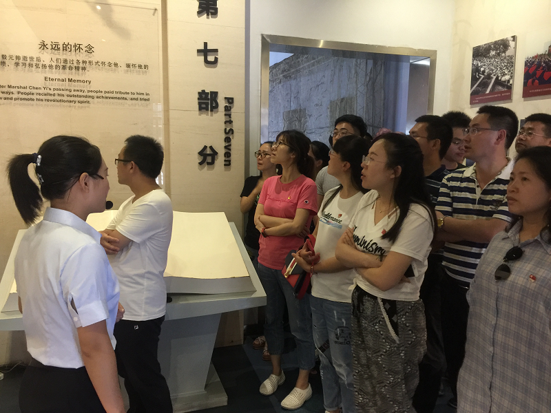 党日活动的第二天,全体党员干部来到了陈毅同志生平事迹陈列馆和陈毅故居。在解说员的带领下,参观了黄桥决战浮雕、主题园林、主题广场等,包括现场陈列的照片、年表、诗词、著述、信札、战役示意图和战绩统计表等。党员干部们共同感念陈毅元帅毕生为共产主义事业英勇奋斗的丰功伟绩,以及为祖国和人民无私奉献的高尚品格。