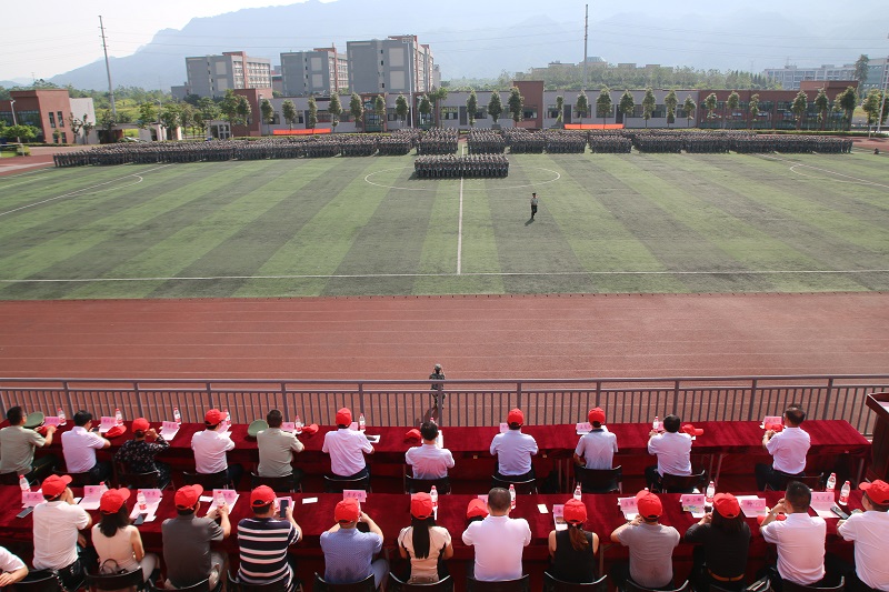 本网讯(文/大学生记者团 汪聂军 图/大学生记者团 陈绪春 谢家乐)9月13日上午9时,重庆工程学院2019级新生开学典礼暨军训成果汇报演出在双桥校区田径运动场隆重举行。重庆武警总队机动支队队长王成、荣誉校长唐一科、校长桂国庆、党委书记兼常务副校长张业平、副校长程昌华、副校长王琼花、副校长蒋国华、校党委副书记盛友兴、纪委书记唐小勇、校长助理谭其贵等多位校领导出席典礼,各二级学院院长、书记、相关职能部门负责人、承训部队教官、双桥校区全体参训教师以及2019级全体新生逾3800人齐聚现场,活动由副校长、双桥校区管委会主任蒋国华主持。