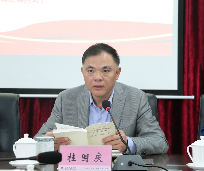 本网讯(文/党委宣传部 图/大学生记者团 陈绪春 赖庆杰)为扎实组织开展好“不忘初心、牢记使命”主题教育,根据重庆工程学院《关于开展“不忘初心、牢记使命”主题教育实施方案》和学校党委关于开展好学习教育的有关要求,10月9日下午,学校举行了主题为“共产党人的初心和使命”的“不忘初心、牢记使命”主题教育第一次集中学习研讨会。校长桂国庆、党委书记兼常务副校长张业平等党委班子成员、二级学院党总支书记、直属党支部书记,教师党支部书记、学生党支部书记及部分职能处室领导干部集体研读了《习近平关于“不忘初心、牢记使命”重要论述摘编》部分篇目和习近平在“不忘初心、牢记使命”主题教育工作会议上的讲话,并作交流发言。重庆市委教育工委指导一组组长、市教委基建后勤处处长胡斌出席并讲话,张业平主持会议。