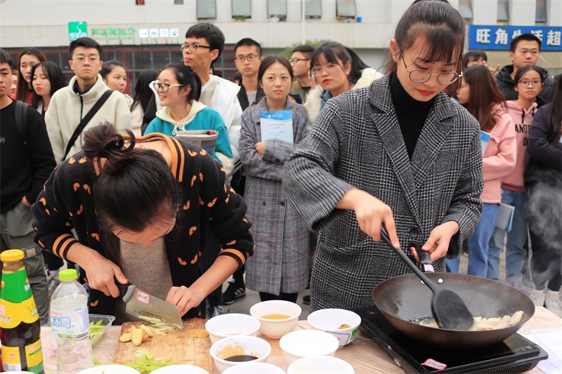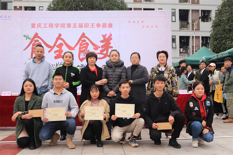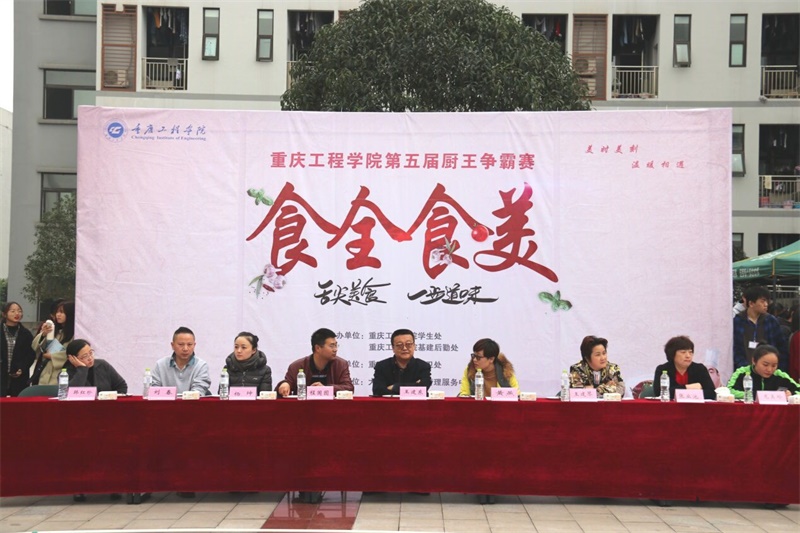 本网讯(文/大学生记者团 邓金玉 图/大学生记者团 谢家乐)11月20日下午,重庆工程学院基建后勤处、重庆工程学院学工部共同主办,大学生餐饮安全管理服务中心承办的重庆工程学院第五届“食全食美”厨王争霸赛在南泉校区和园五号广场举行。共有来自土木学院、管理学院等30组学生选手报名参加。校长助理王建东、学生处处长黄燕、基建后勤处副处长程国园出席活动,与相关部门负责老师,以及学校各食堂经理共同担任比赛评委,共有三百余师生赶到现场观看。