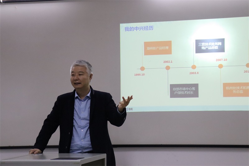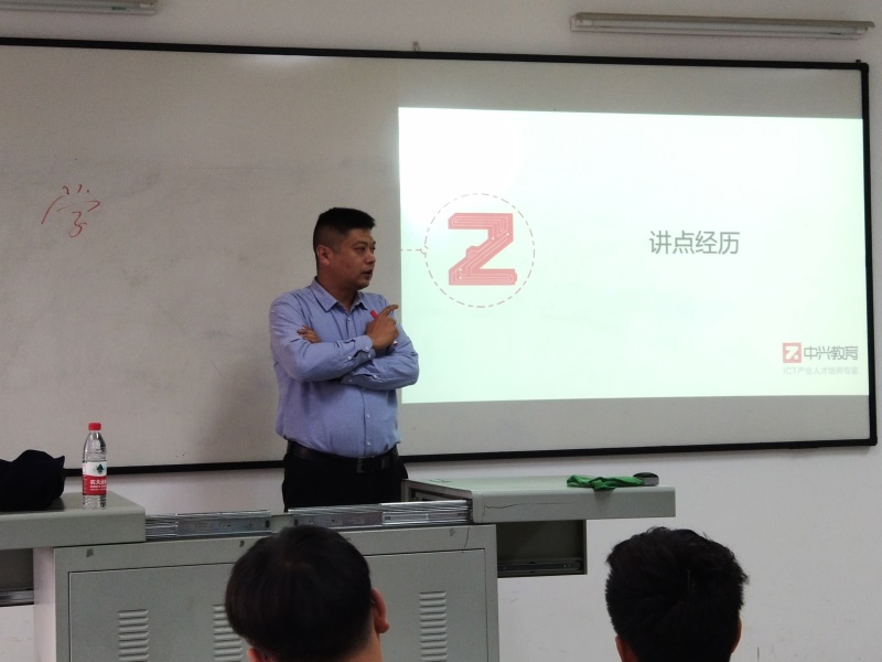 本网讯(文/图 校企合作办 黄梅)12月2日下午,无锡中兴教育管理有限公司市场管理部部长章程带领7位区域总经理奔赴双桥校区,给“中兴ICT学院”2019级新生开展了“走进5G时代”主题系列演讲活动。