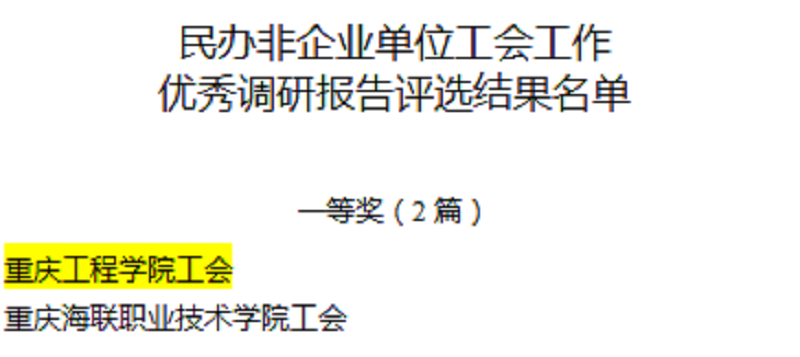 本网讯(文/图 校工会 熊力)为学习贯彻习近平总书记同中华全国总工会新一届领导班子成员集体谈话时发表的重要讲话精神,按照中国教科文卫体工会《2019年调研工作实施方案》的要求,12月17日,重庆市教科文卫体工会发布了《关于2019年基层工会优秀调研报告评选结果的通报》(渝教科文卫体工〔2019〕66号)评选通报文件,我校上报的两份调研报告均荣获一等奖,本奖项也是全市民办高校唯一同时荣获殊荣的高校。
