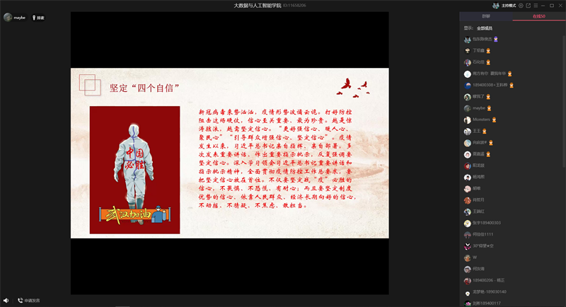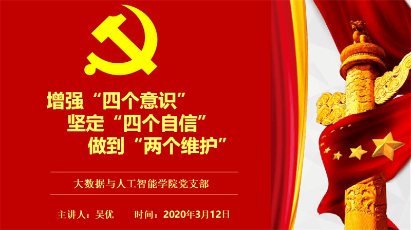 本网讯(文、图/大数据与人工智能学院 徐浩 陈星材)3月12日晚,大数据与人工智能学院党支部书记吴优为全院师生党员、发展对象、入党积极分子上了一堂别开生面的线上党课。吴书记以在线平台授课的方式,深刻地讲述了在抗疫的形势下,党员如何增强四个意识,坚定四个自信,做到两个维护。
