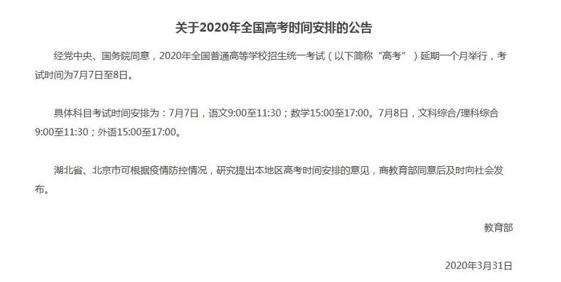 今天,教育部宣布,经党中央、国务院同意,2020年全国普通高等学校招生统一考试延期一个月举行,考试时间为7月7日至8日。湖北省、北京市可根据疫情防控情况,研究提出本地区高考时间安排的意见,商教育部同意后及时向社会发布。高考延期,引发社会广泛关注。