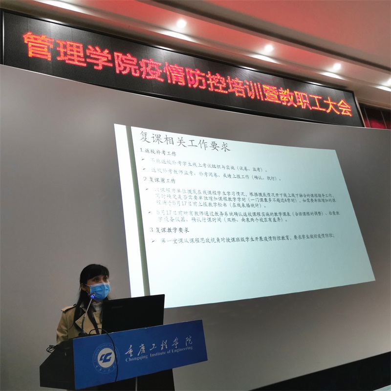 副院长李玲对学院接下来的复课工作进行了安排部署,根据学校和学院的工作要求,5月14日将全面开展各项工作。近期工作包括做好学生补考工作,复课后第一堂课要求对全体学生进行疫情防控心理教育;授课期间要配合学生工作室做好学生的“日报”和“零报”工作,要把学生的生命安全放在第一位;遇到突发情况要按照学校防控工作预案,在第一时间做好应急处理;教职员工要做好个人健康状况监测,并配合学校和学院做好防控工作。
