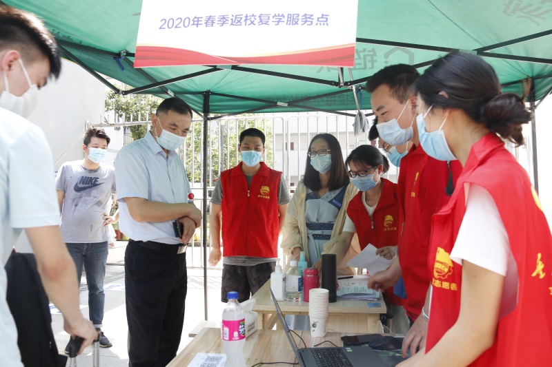 桂国庆一行先后来到学校大门、公寓报到点,实地检查了学生入校工作流程,现场工作人员有序组织返校学生通过指定区域,有序进行身份扫码核验、体温测量和消杀防疫等工作,桂校长充分肯定了现场教职工和志愿者们的细致工作,叮嘱他们要把好校门“入口关”,按照相关要求做好信息核验、登记等工作,确保返校学生们平安复课。