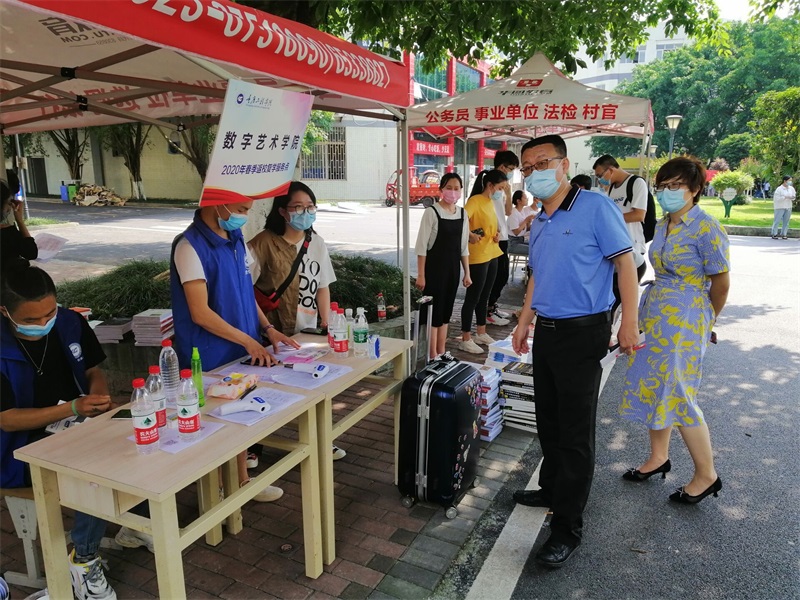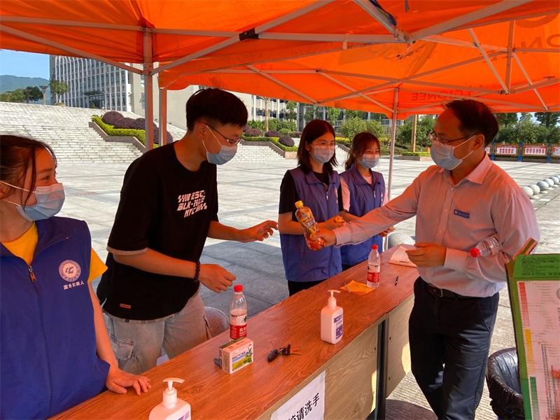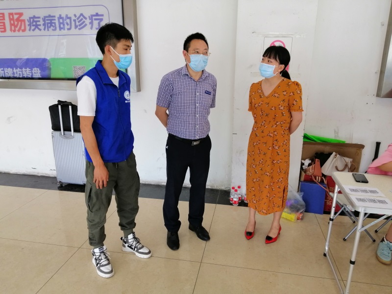 蒋国华一行分别走访了大足高铁南站、大足汽车站、双桥校区接待点,对接待工作一线的教师和志愿者们在工作中的努力和付出表示感谢,他叮嘱志愿者们在做好接站工作的同时注意自身安全,保护好自己,鼓励志愿者们再接再厉,圆满完成学生返校接站工作。