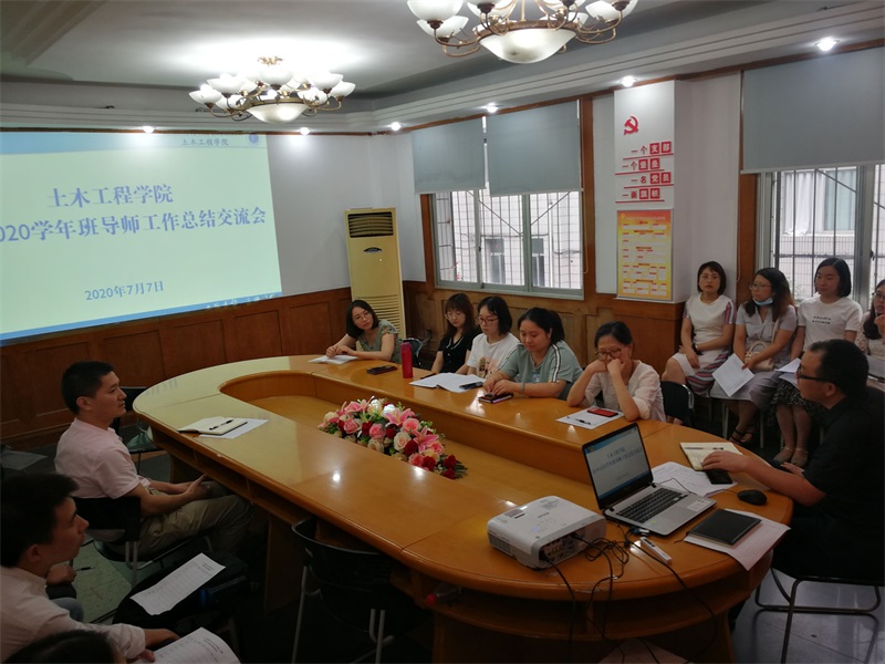 本网讯(文/图 土木工程学院李龙)7月7日下午,土木工程学院组织开展2019-2020学年班导师工作总结汇报会,会议由学院党总支李龙书记主持,执行院长雷江院长、全体班导师参加。