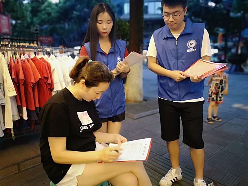 8月6日,在团长寿区委的指导下,来自我校“三下乡”团队的16名青年普法志愿者组织开展“法治文化进基层”活动,走进长寿区内的街道和商铺,向当地群众发放《民法典》宣传手册,并通过宣讲具体案例、现场答疑解惑扽方式帮助群众普及《民法典》中的相关知识。与此同时,实践团队还准备了相关调查问卷,为能够更好地了解市民们对相关法律知识的学习情况。