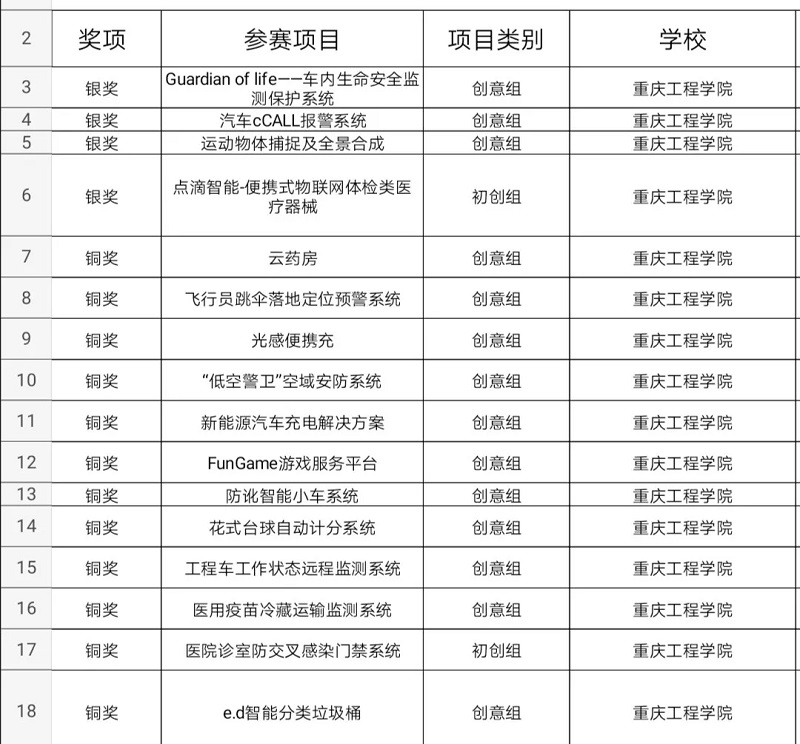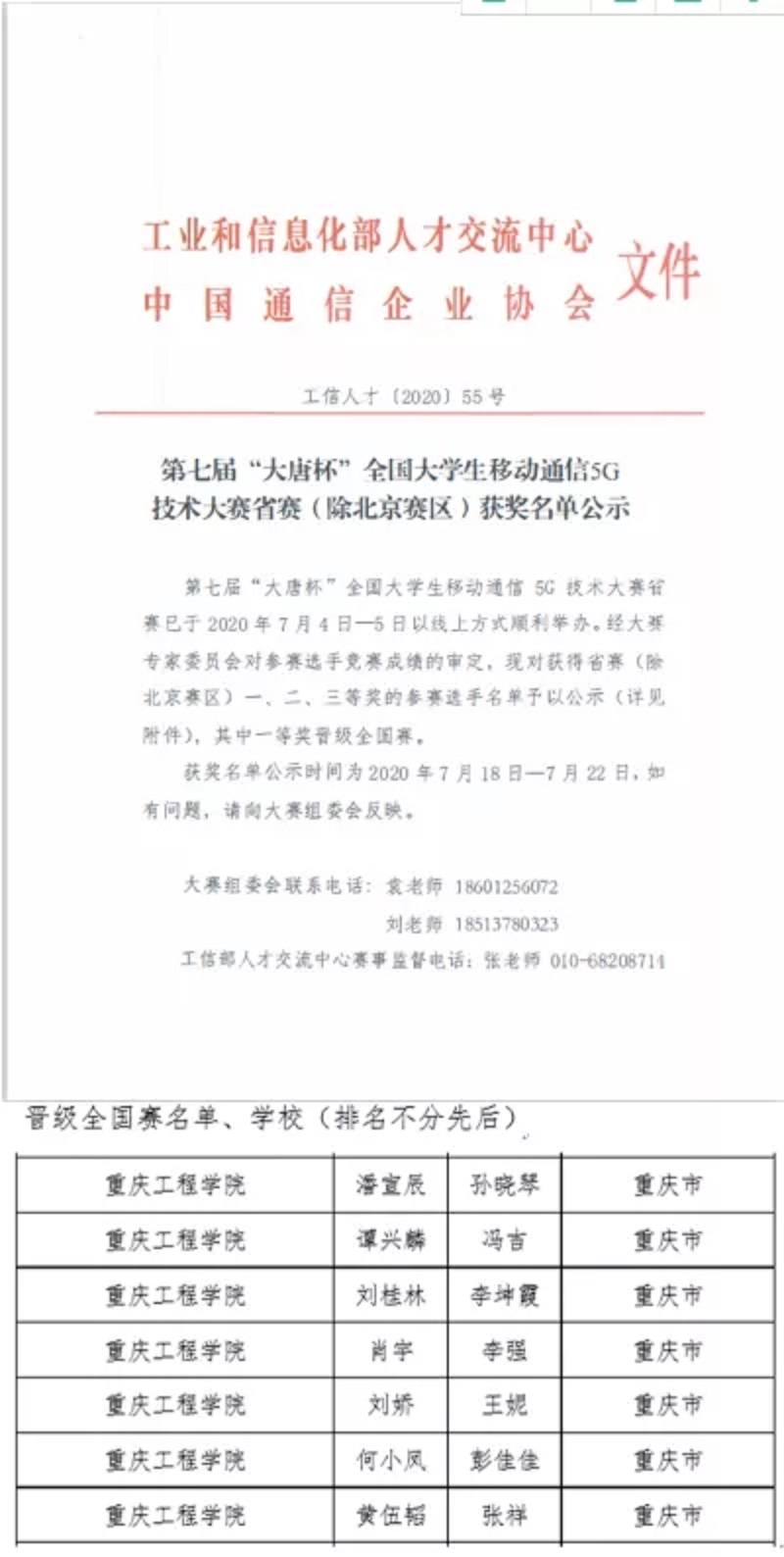 7月4日-5日,第七届“大唐杯”全国大学生移动通信5G技术大赛省赛以线上方式举办,电子信息学院2017级的78名同学代表学校参加比赛,最终获得38个奖项,本科组省赛一等奖7项、二等奖12项、三等奖19项,省赛一等奖直接晋级全国赛。8月25-26日,由重庆市教育委员会主办的“双创大赛”重庆赛区决赛金奖争夺赛以线上形式开展,电子信息学院学生的参赛项目获得市级银奖2项,铜奖3项。
