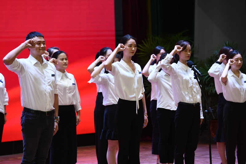 接下来是入职宣誓仪式,30名新进教师代表依次走上舞台中央,在领誓人的带领下庄严宣誓,表达了自己的就职决心。