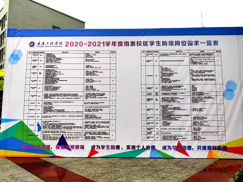 本网讯(文/图 大学生助理事务委员会 舒天缘)9月12日-13日,我校南泉校区和园5号广场举办了2020-2021学年学生助理招聘会。招聘会由学校大学生助理事务委员会主办,包括大学生科研创新服务中心、大学生教学信息管理服务中心、大学生记者团在内的24个学生助理团队来到现场开展招聘工作,共有872个学生助理招聘岗位。
