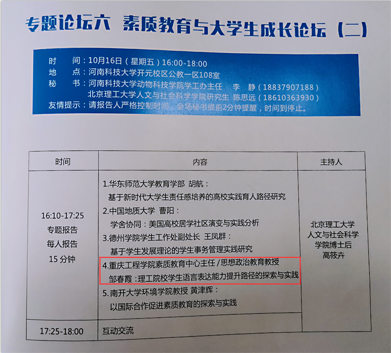 邹春霞教授在“素质教育与大学生成长”论坛作了汇报,围绕“理工院校学生语言表达能力提升路径的探索与实践”研究主题与其他同仁作了展示交流。邹教授现场分享了自己关于“三级九阶口才进阶训练”的研究成果,内容以我校在学生口才训练方面的成绩为主,包括如何借助晨课演讲、晨课导读、演讲比赛等方式来改善学生的学习思维和提升学习能力,成果汇报获得了在场专家们的一致赞许。此次论坛形式新颖,内容丰富,对弘扬中国特色的素质教育思想,扎根中国大学发展素质教育具有积极意义。