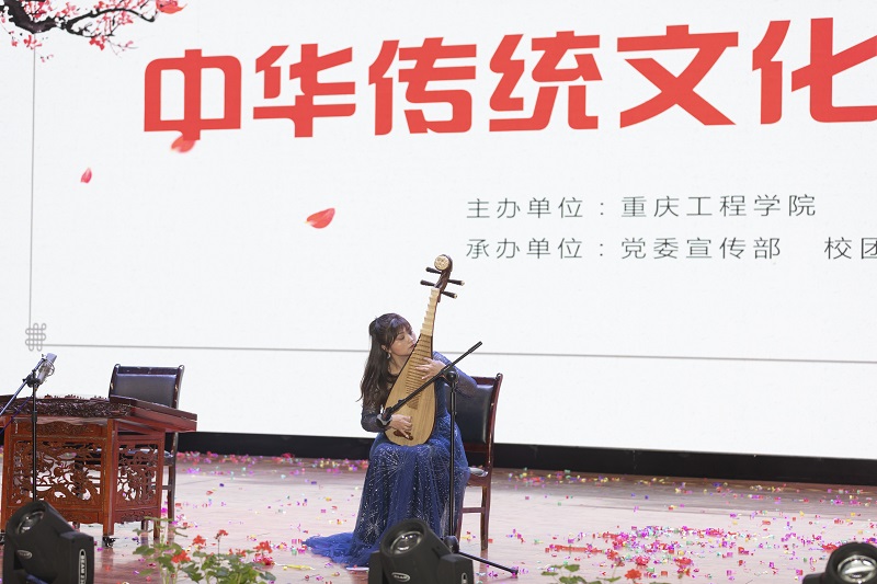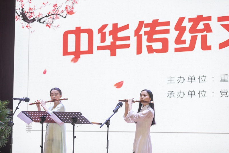 最后,重庆民乐演奏家和学校师生共同带来了一场精彩纷呈的中华传统文化音乐会。重庆市歌剧院青年竹笛演奏家赵兰、重庆市歌剧院首席琵琶演奏家叶敏捷、重庆市歌剧院扬琴青年演奏家许雯雯、青年竹笛演奏家姜婷等参演嘉宾受邀来到现场倾情演出,音乐会传统文化气息浓郁底蕴深厚。竹笛、扬琴、琵琶等富含中华独有文化基因的民族乐器依次亮相,演奏出民族音乐的华美乐章。