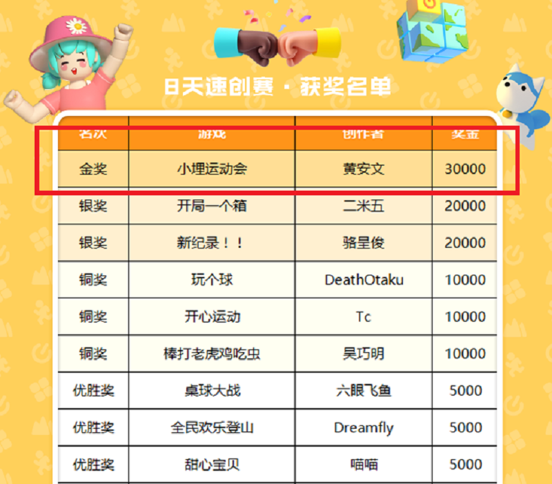 本网讯(文/图 软件学院 王平)10月26日,由知名公司UGC游戏创作平台《重启世界》举办的“《重启世界》全民游戏制作·8天速创赛”比赛结果公布,我校软件学院FunGame游戏创作社团选送的原创游戏项目《小埋运动会》斩获金奖,参赛团队赢得奖金3万元。