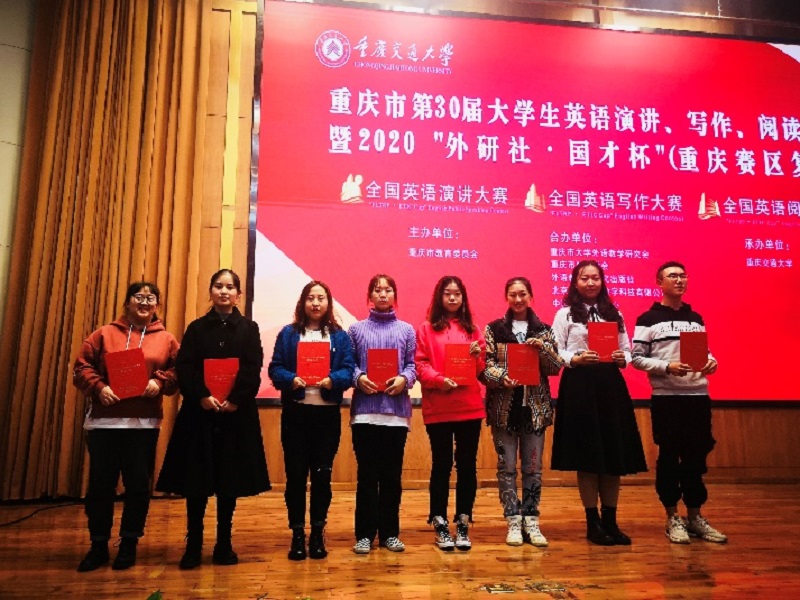 本网讯(文/图 通识学院 王晓晓)10月31日,重庆市第30届大学生英语演讲、写作、阅读比赛暨2020年“外研社·国才杯”全国英语演讲、写作、阅读大赛重庆赛区比赛在重庆交通大学举行。我校9名学子组成参赛代表队,由教师黄柳、李雪冬带队参赛,与来自重庆大学、西南大学、四川外国语大学等多所高校选送的近300名选手展开同台竞技。
