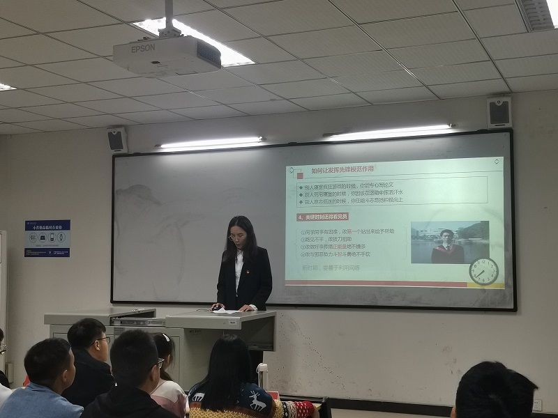 李江瑜同学以《党员是什么》为题,从什么是党员的先锋模范作用,党员先锋模范作用的意义以及如何发挥党员先锋模范作用向同学们进行了讲解。号召同学们要敢为时代先锋,要敢做他人模范。党的明天靠我们,而我们,青春正当年。