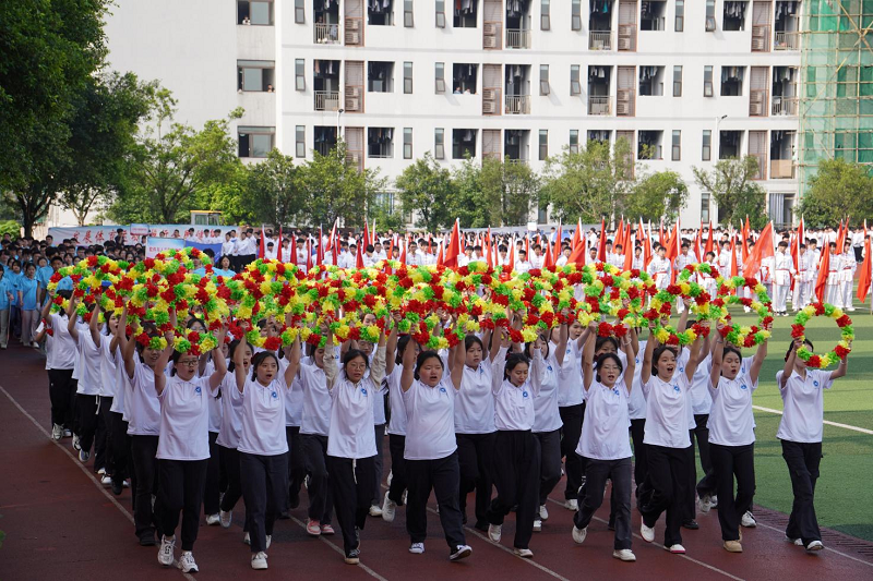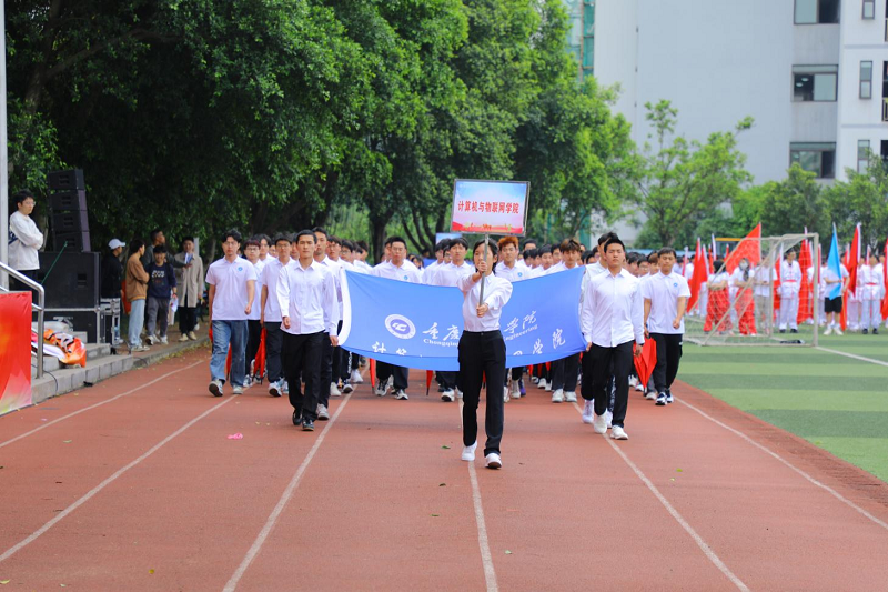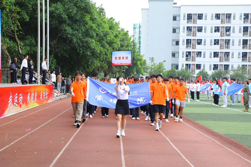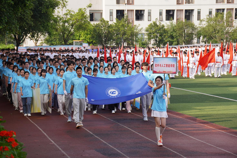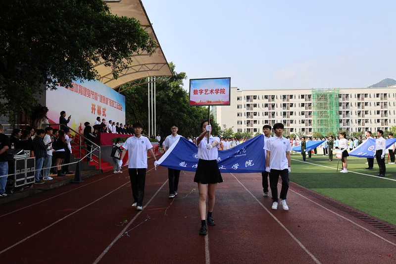伴随着激昂的《运动员进行曲》,迎来了开幕式的第一项——各方队入场。国旗、校旗、彩旗和各学院方阵依次入场,同学们迈着有力的步伐,满怀激情,用他们灿烂的笑容点燃了四月的星火。首先踏着整齐的步伐走进会场的是国旗方阵,跟随其后的是校旗、运动会会旗、运动会会徽和校训校风方阵;紧接着,是由电子信息学院组成的彩旗方阵和数字艺术学院组成的花环方阵,舞旗队伍动作刚劲有力;学院方阵各显特色,直播助农演示趣味横生,汉服表演赢得掌声雷动……