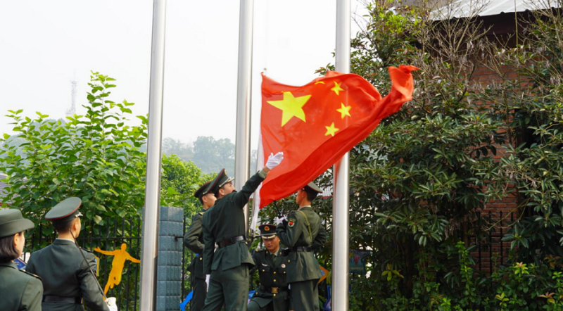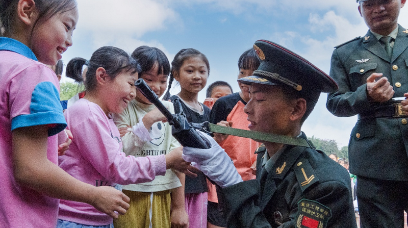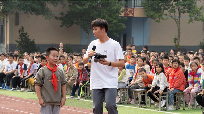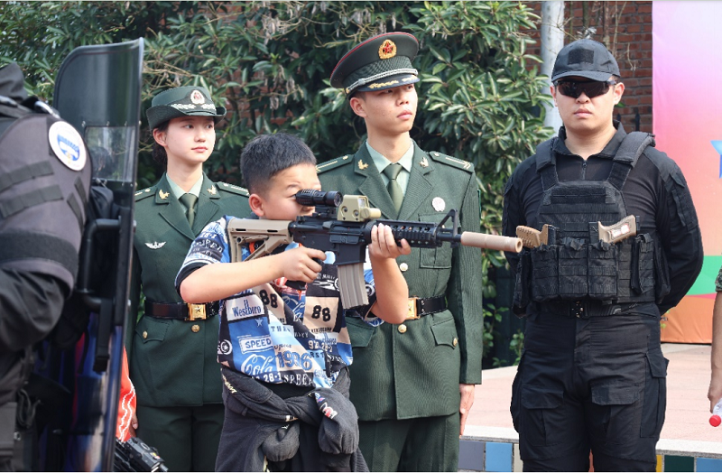 活动在庄严的升旗仪式后拉开帷幕,鲜艳的五星红旗缓缓上升,800多名小学生坚定地看着重庆工程学院的哥哥姐姐将国旗升起。升旗仪式后由大学生记者团的同学给南温泉小学全体师生简要介绍了民用无人机在实际应用与功能,紧接着由国旗护卫队的退役大学生士兵郑俊林、李杰为同学们简要讲解了关于无人机在军事领域的应用及现代军事战争中对无人机的反制方法,科普了人防常识,激起同学们对国防科技的热爱。最后,又用我校自带的“枪械”模型给同学们进行了轻武器常识的介绍,并选代表开展了水弹枪射击体验。