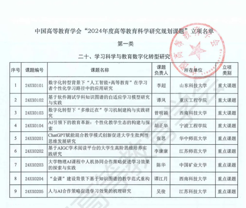 本网讯(文/图 科技处 李世毅)近日,中国高等教育学会公布了“2024年中国高等教育科学研究规划课题立项名单”,我校软件学院谭凤老师申报的课题“基于软件测试学科知识图谱的自适应学习模型研究与实践”获得“学习科学与教育数字化转型研究”类重大课题立项。