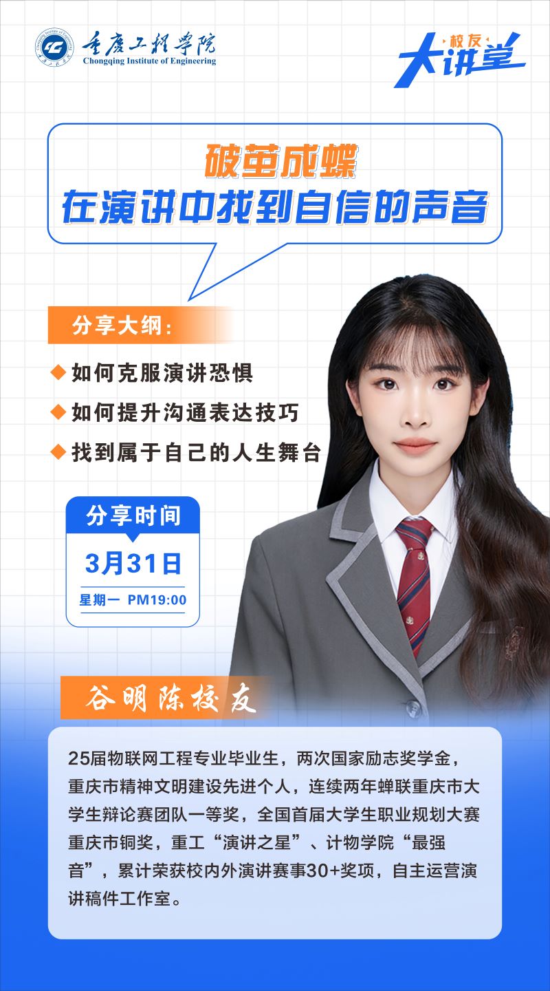 本网讯(文/就业指导中心 叶秋清 图/就业指导中心)为充分发挥优秀校友的榜样引领作用,助力在校生科学规划学业生涯、提升综合素养,3月31日晚,由学校就业指导中心举办的“破茧成蝶——在演讲中找到自信的声音”校友交流活动在鹅直播平台圆满举行。活动特邀2021届物联网工程专业优秀毕业生谷明陈担任主讲嘉宾,吸引全校4200余名学生在线参与。