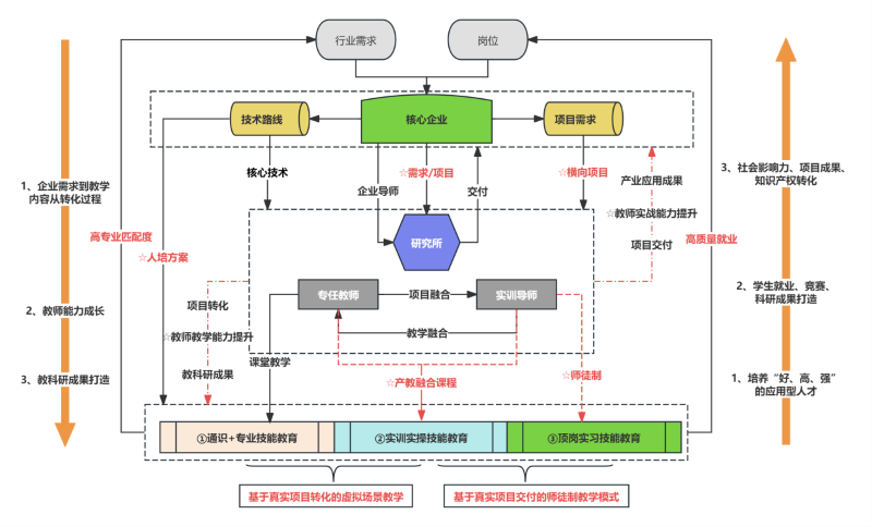 人员互通。实施教师“双栖”制度,研究主要实训导师下达128课时教学任务,学院教师参与研究所项目挂职锻炼。成果互转。企业在实践中积累的项目经验和数据,以论文或科研成果的方式,通过校内进行转换。校内教学和研发成果,以项目为出口实现转化和变现。发展互促。通过联合攻关、经验交流、月度座谈会等机制,实现院所人员能力互补、协同共进。