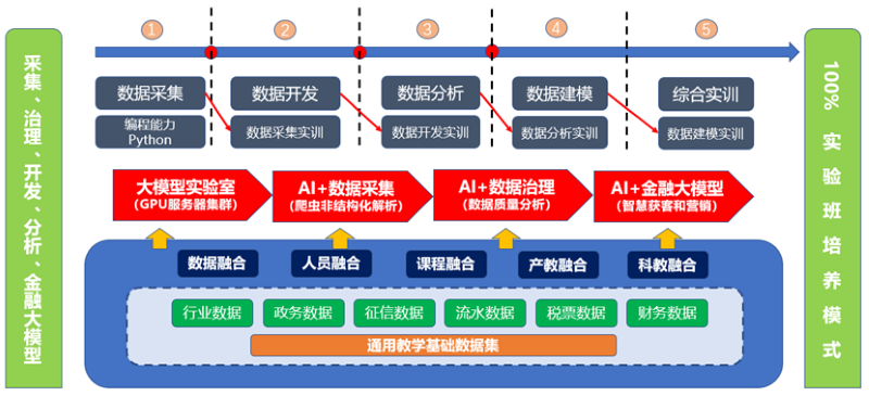 截至目前,大数据研究所及人工智能研究所已建立起以商业实作为主理论培训为辅的、覆盖大数据和人工智能产业链条的特色课程体系;构建和打造了包括《行业大数据应用系统综合设计》《行业大数据可视化项目综合设计》《大数据综合开发技术与应用》《数据仓库技术与应用》《人工智能应用综合技术》《自然语言处理综合技术》《智能风控技术与应用》等10余门专业实训课程;构建和配备了最为前沿的大模型服务器等基础设备为持续培育并输出高素质的应用型人才奠定了坚实的基础。