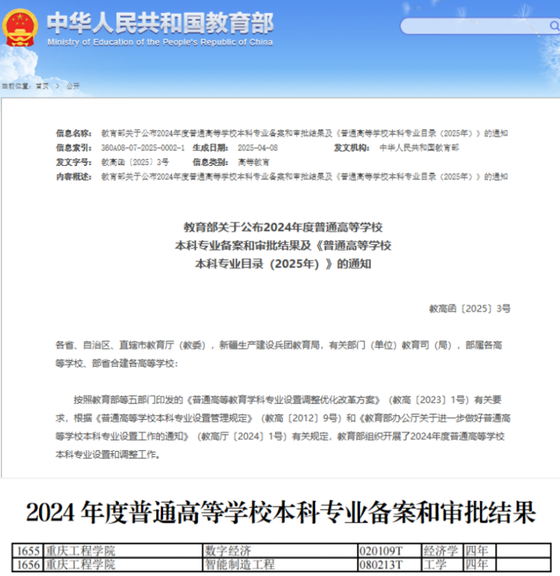 本网讯(文/图 教务处 罗蓓蓓)近日,教育部正式公布了2024年度普通高等学校本科专业备案和审批结果。我校申报的数字经济(020109T)、智能制造工程(080213T)2个本科专业成功获批,实现了学校经济类学科专业布局的新突破。至此,学校本科招生专业总数达30个,覆盖工学、管理学、艺术学、文学、经济学五大学科门类。