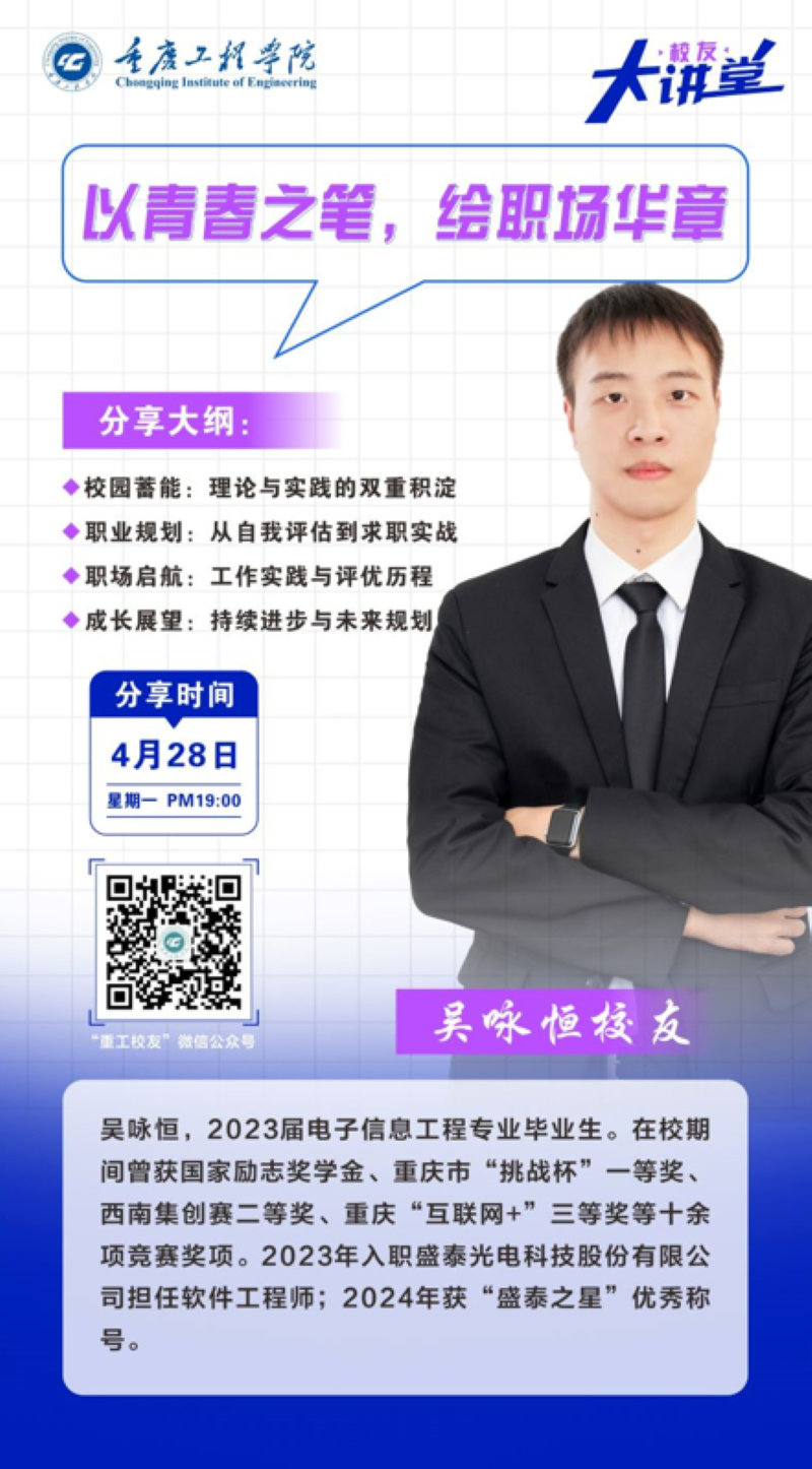 入职两年间,吴咏恒凭借测试代码优化和产线效率提升项目获评“盛泰之星”,并总结出技术深耕、团队协作、终身学习三大职场成长法则。他特别强调在人工智能与物联网技术浪潮中,既要向技术专家方向精进,也要培养项目管理等软技能。讲座的最后,他寄语学弟学妹:“技术迭代加速,唯有保持好奇心与学习力,才能在职场中行稳致远。