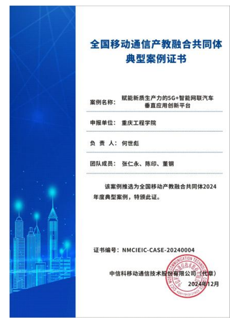 学院申报的“赋能新质生产力的5G+智能网联汽车垂直应用创新平台”,案例获评为全国移动产教融合共同体2024年度典型案例。
