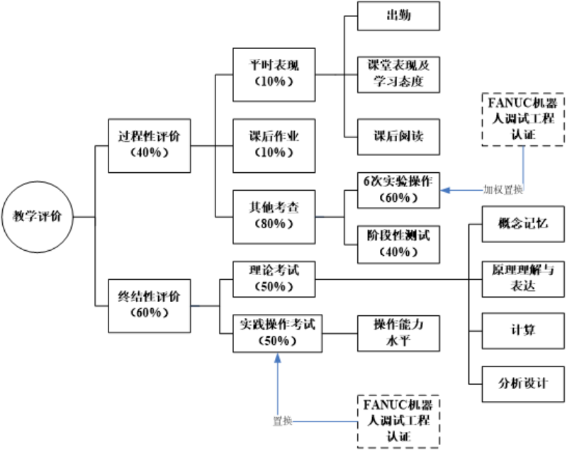 为了更加突出能力生成这一理念,学院创新实施引入行业认证要素参与课程成绩评定,将参加并通过FANUC机器人官方认证的,可以以认证证书置换实验操作成绩,更加注重技能水平在成绩构成中的权值,从而在推动教学改革的同时,引导学生建立学以致用的学习观念。