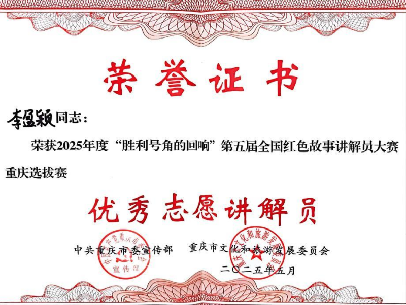 本次大赛由中共重庆市委宣传部、重庆市文化和旅游发展委员会联合主办,旨在通过红色故事讲解传承革命精神、培育社会主义核心价值观。大赛分专业讲解员和志愿讲解员两组,设置个人展示、自选讲解等环节,聚焦纪念中国人民抗日战争暨世界反法西斯战争胜利 80 周年,挖掘抗战故事中的民族精神。李盈颖在杨双溢老师的指导下,精心准备。比赛中紧扣主题,以充沛的情感和生动的表达,讲述了具有地域特色的红色故事,展现了扎实的讲解功底和对红色文化的深刻理解。