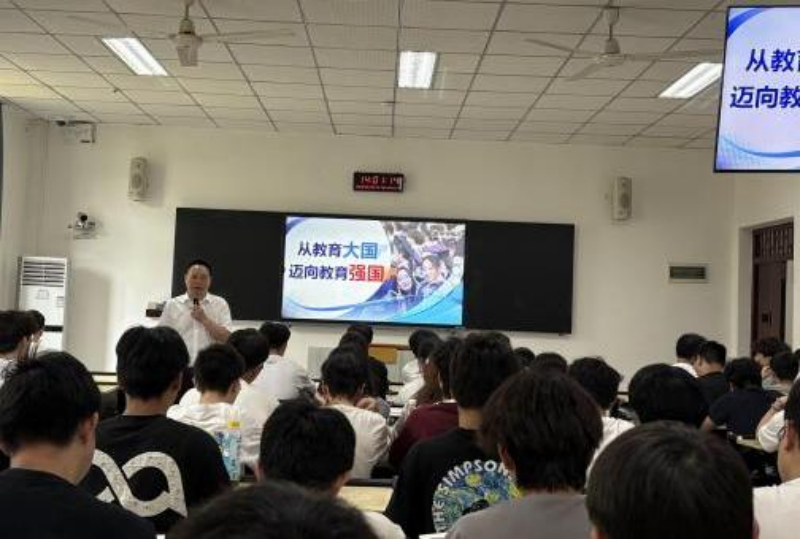 本网讯(文/图 马克思主义学院 郑金丽)为坚持思政课建设与党的创新理论武装同步推进,5月20日下午,学校副校长谭明术深入思政课课堂,以“从教育大国迈向教育强国”为题,在六教 112 教室为我校 23 级土木3 班、4 班同学讲授“形势与政策”课。