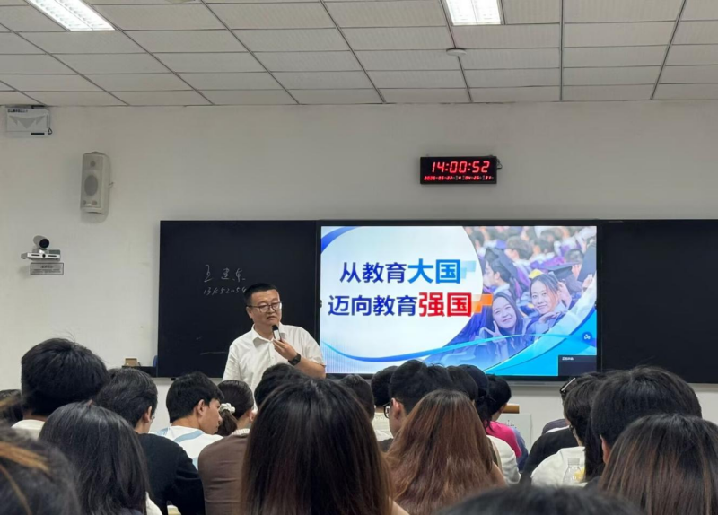 本网讯(文/图 马克思主义学院 程爱 )为充分发挥思政课铸魂育人主渠道、主阵地作用,提升思政课堂教学质量,5月22日,副校长王建东走进课堂,为南泉校区23营销6-7班学生讲授了“从教育大国迈向教育强国”的形势与政策课。