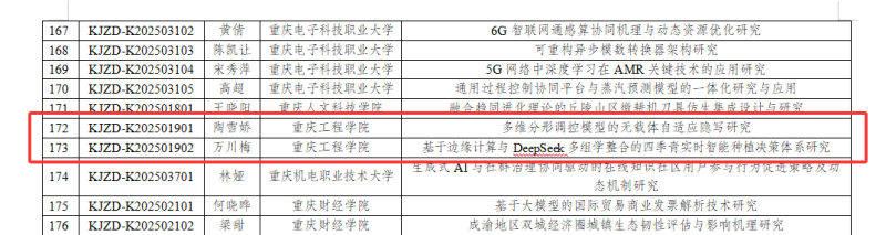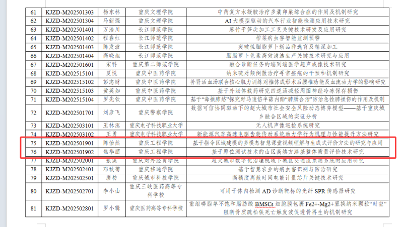 本网讯(文/图 科技处 李世毅)在重庆市教委近日公布的2025年度市教委科学技术研究计划项目立项名单中,我校24个项目名列榜单。其中,《基于指令区域建模的多模态智慧课堂视频理解与生成式评价方法的研究与应用》《基于原位测试技术的山区高填方路基整体质量评价技术研究》项目获得重大项目立项,《多维分形调控模型的无载体自适应隐写研究》《基于边缘计算与DeepSeek多组学整合的四季青实时智能种植决策体系研究》获得重点项目立项,另有20个项目获得青年项目立项,立项等级、数量,均位列市同类高校首列。