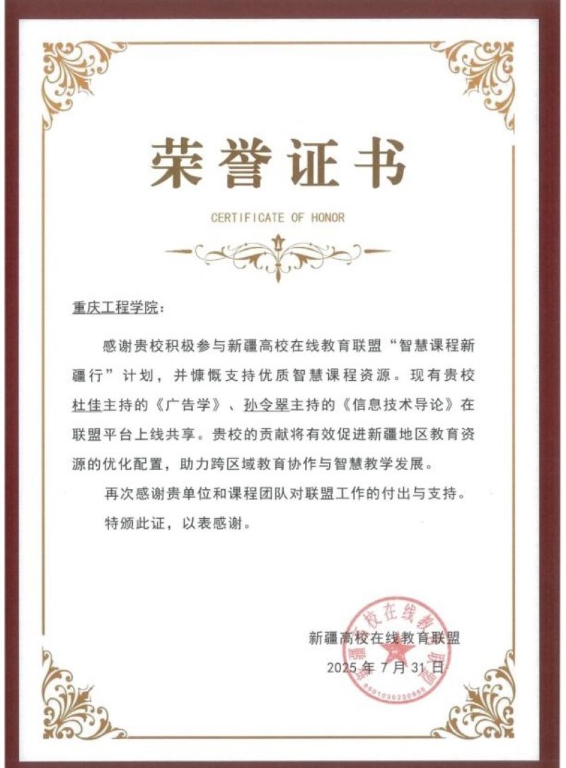 本网讯(文/图 教务处 罗蓓蓓)为贯彻落实《教育强国建设规划纲要(2024-2035年)》要求,深入推进“慕课西部行计划2.0”,促进东西部高校优质教育资源共享。在慕课西部行工作委员会统筹下,新疆高校在线教育联盟启动“智慧课程新疆行"共享活动。我校两门课程——《广告学》及《信息技术导论》入选首批精品智慧课程,并上线新疆高校在线教育联盟平台。