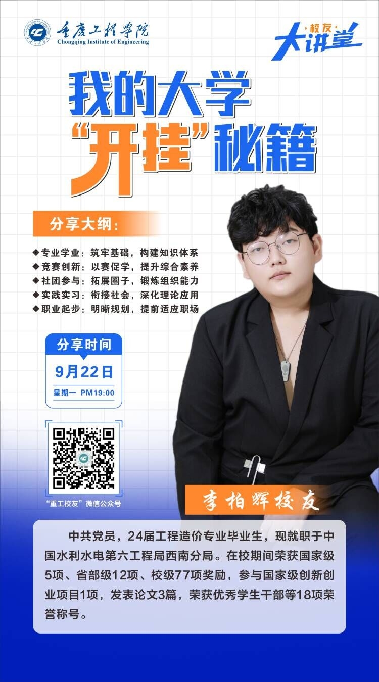 在分享会上,李柏辉结合自身经历,将大学成长归纳为“五大引擎”。首先,他强调专业基础是根本,建议学弟学妹扎实学习工程计量、项目管理等核心课程,逐步构建系统化的知识体系。其次,他认为竞赛创新是成长的加速器,并分享了自己参与国家级创新创业项目的经验,指出从立项到落地的全过程比结果更为重要。接着,他表示社团参与能够有效拓展视野,通过担任社团负责人,自己的统筹协调能力得到了显著提升。此外,他鼓励大家在实践实习方面早规划、勤尝试,主动将课堂所学应用于实际工作中。最后,关于职业起步,李柏辉强调精准定位的重要性,建议通过行业调研明确发展方向,并制作具有差异化的个人简历。
