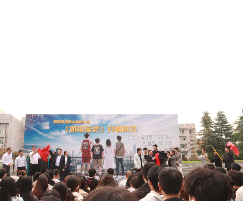 在热烈的掌声中,与会领导和剧组成员共同为《奶茶滚烫》开机揭幕。校领导随后向剧组成员及学生代表发放“开机大吉”红包,预祝拍摄顺利、作品圆满成功。仪式最后,全体人员合影留念,记录下这一具有纪念意义的时刻。
