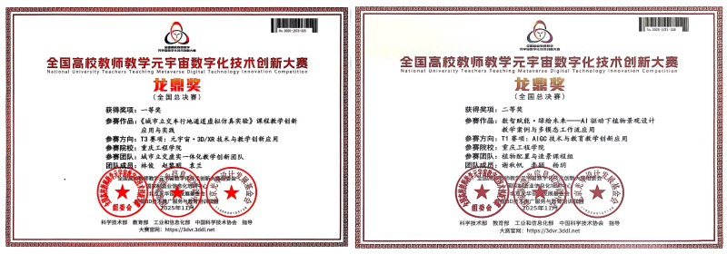 我校智慧城市建设学院林俊团队携作品“《城市立交车行地通道虚拟仿真实验》课程教学创新应用与实践”参赛,荣获T3赛道“元宇宙·3D/XR技术与教育教学创新应用”全国总决赛一等奖;谢秋帆团队携作品“数智赋能·绿绘未来—AI驱动下植物景观设计教学案例与多模态工作流应用”参赛,荣获T1赛道“AIGC技术与教育教学创新应用”全国总决赛二等奖。