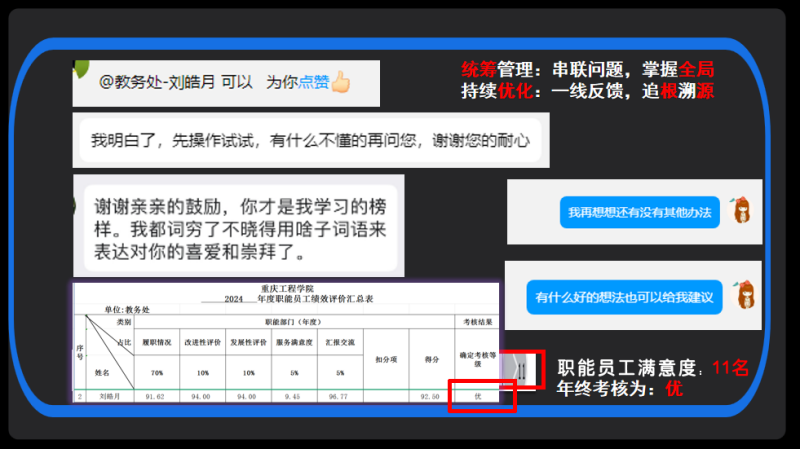 于是,她化身“流程医生”,开始对工作进行深度“体检”。她不断自问:“应该这样吗?”“问题在哪?”并着手进行板块梳理与优化。经过她的努力,该板块的问题点从13个减少至1个,处理时间从4天缩短至4小时,并成功实现了从线下到线上的全面转型,将师生从繁琐的纸质流程中解放出来。