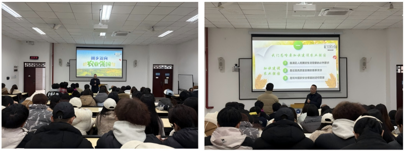 本网讯(文/图 马克思主义学院 郑金丽)12月23日上午,学校副校长谭明术在六教203教室为我校24级营销1、2班同学讲授题为“阔步迈向农业强国”形势与政策专题课。