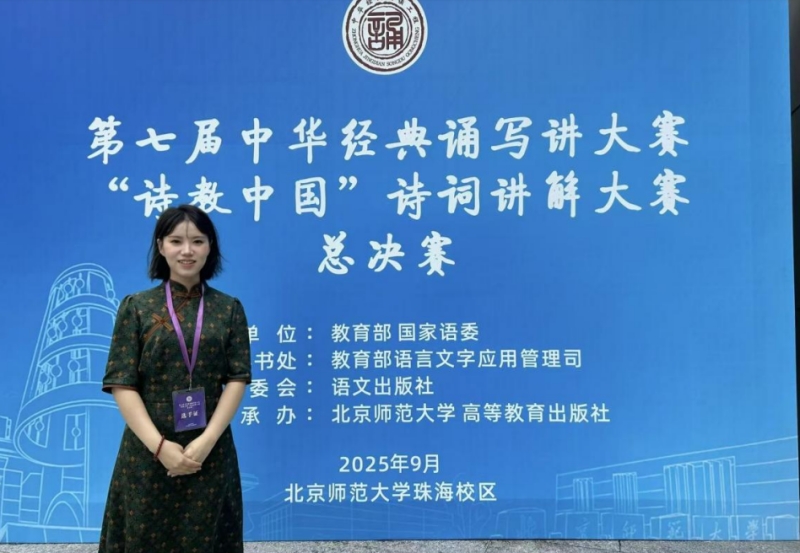2025年9月7日,“诗教中国”诗词讲解大赛总决赛在北京师范大学珠海校区拉开帷幕。李晨燕奔赴赛场,在全国舞台上展现巴渝文化传承的独特魅力。在决赛现场,她以饱满的热情、专业的素养,将诗词之美与文化传承相融合,赛出了风采,更赛出了我校在中华经典传播领域的气势,为地方文化名片增添了亮丽一笔。