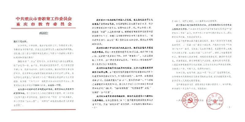 感谢信指出,2025年是“十四五”收官之年,也是教育强市建设全面提速、实干奋进的一年,全市教育发展总体水平稳居全国中上行列、西部第一方阵,取得了一系列标志性、突破性成果。在全市教育事业高质量发展进程中,重庆工程学院始终强化党建思政引领,以“两融一改”为重要抓手驱动学校内涵发展,各项工作成效显著、可圈可点,值得充分肯定。