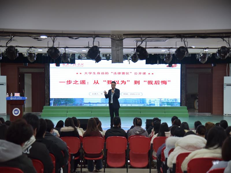 本次公开课特邀双桥经开区管委会办公室主任曾华主讲。曾华是首届“重庆市十大法治人物”、全国普法先进工作者、全国模范人民调解员。他拥有16年法律工作经验,累计为中小学及企事业单位授课120余场,受众超10万人次。授课过程中,曾华主要从防范意识、劳动意识、自律意识三个方面展开讲解,结合基层司法工作中的真实案例,深刻剖析了大学生日常学习生活中看似不经意“小举动”背后潜藏的法律风险,清晰阐释了“我以为”与“法律红线”之间的紧密关联,引导师生认清违法犯罪的沉重代价,时刻保持对法律的敬畏,明辨是非、远离雷区。