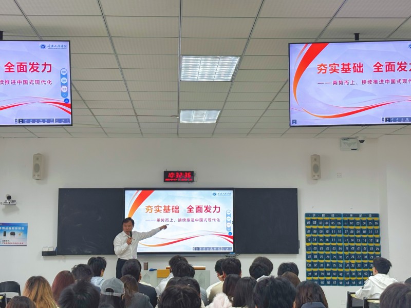课堂上,唐小勇以“中美铁路对比”为案例,对比美国加州高铁推进缓慢与中国建成全球最大高铁网络的鲜明反差,生动诠释“集中力量办大事”的制度效能,强调坚持党的全面领导、保持战略定力是中国式现代化行稳致远的根本保证。唐小勇勉励在场青年学子,要把个人理想追求融入民族复兴伟大征程,坚定信念、勤学笃行、锤炼本领,以青春之我、奋斗之我,为接续推进中国式现代化贡献重工青年力量。