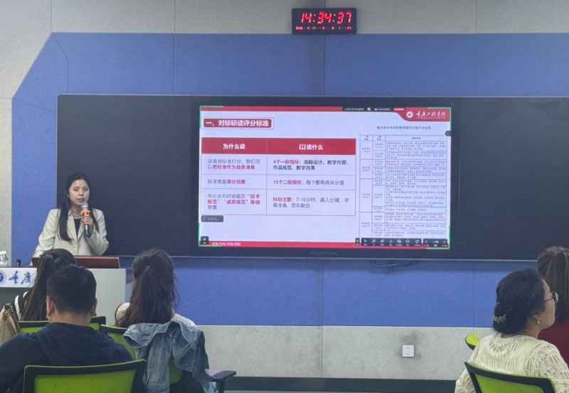 评委视角:洞察评审标准,把准赛道方向。周小波立足赛事全局,围绕大赛复盘、评委视角、赛道研判、全流程备赛四大板块开展深度指导。以往届获奖情况系统总结成功经验、查摆共性问题,精准锚定我校参赛方向与行动路径。聚焦微课竞赛从选题、内容、设计、教态、技术五大评审维度进行系统分析,从评委视角解密高分密码。他强调聚焦新赛道、抢抓新机遇、赢在新起点,明确将人工智能通识微课、实验教学数字化创新微课作为下一阶段重点培育、冲击高水平奖项的核心方向,号召全体参赛教师扎实打磨参赛材料、以长期攻坚姿态全力备赛。